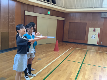 理科の学習で、空気砲を使った実験を行いました。空気砲が飛ぶ仕組みから、押し縮めた空気が戻ろうとする性質を理解しました。