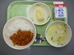 10月24日(金)ごはん、牛乳、チキンライスの具、クリームスープ、りんご