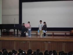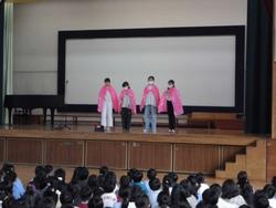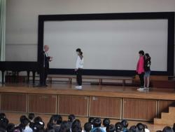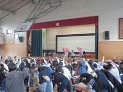 10月28日の朝会では、副校長より目標に向かって努力することについて話がありました。また、1年生の代表児童が今月の生活目標について発表し、泉区青少年活動についての表彰もありました。最後は、保健委員会を中心にストレッチも行いました。今年度岡津小学校では、学校保健委員会の活動の一つとしてけがをしない体つくりに取り組んでいます。
