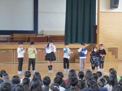 本日の朝会は、明日(2月18日)泉区合同学習発表会に参加する5組が全校児童に向けて発表しました。グループに分かれて劇、なわとび、けん玉、合奏、ダンスの発表をしました。明日の学習発表会でも今日のような素敵な発表を期待しています。