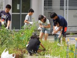 朝会でお知らせのあった参加賞デザインですが、さっそくクラス選抜作品を見て、投票の準備をしていました。また、5組は、夏の間に伸びた「なかよしひろば」の花壇の野菜や雑草を抜いて、きれいにしました。