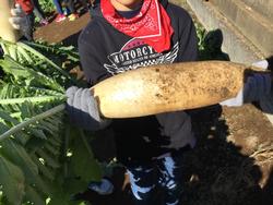 12月14日(金)、「神奈川県のみりょくって何だろう?」の学習で、みさき魚市場と三浦農業技術センターに見学・三浦大根抜き体験をしに行きました。みさき魚市場では、新設された市場に出荷されたマグロを見ました。子どもたちは「最近マグロが揚げられたんだ。」「どのくらいマグロがあるのだろう。」と気づいたことや気になったことをたくさんもちました。三浦農業技術センターでは、三浦大根抜き体験をしました。子どもたちは「とても重くて大きい。」「大根抜きはとても大変だ。」「抜くときにはコツがいるんだな。」と実感しました。また、職員の方に「三浦大根はどのくらい重いんですか?」「どうして三浦大根は“三浦”と言うんですか?」とたくさん質問し、三浦大根のことをもっと知ることができました。抜いた大根は子ども一人ひとりに配られ、持ち帰りました。農業技術センターの方々、ありがとうございました。