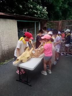 1日目は金沢動物園と宿泊施設がある野島青少年研修センターに行きました。1日目は曇りで、直射がなく風があり、とても過ごしやすかったです。グループで協力しながら動物園内をグループごとに見学した後、日よけタープの下で骨と筋肉の学習をしました。動物園のスタッフの方の話を聞いたり、鳩の骨の剥製と鳩を見比べながら骨格と筋肉の仕組みについて考えたり、手指を消毒して骨のレプリカに触ったりました。興味をもち活動していました。