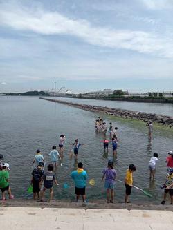 2日目は、6時半に起床して体温をチェックした後、シーツをたたんだり、荷物整理をしたりしました。午前中から良い天気で、1日目よりも気温が高く、磯遊びには最適なコンディションでした。野島は、朝に干潮を迎え、少しずつ潮が満ちてくる時間帯でしたので、深さを見ながらエリアを限定して磯に入って遊びました。安全に気をつけて活動することができました。