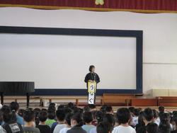 今年度最初の朝会を行いました。校長講話では、学校教育目標の「つなぐ」について話しました。また、6年生の代表児童が4月の生活目標について発表しました。