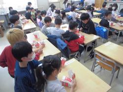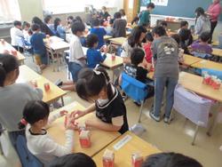 1年生が給食の牛乳パックを片付けることが難しかったので、6年生が優しく教えていました。1年生は一人で牛乳パックを開けられるようになりました。微笑ましい場面でした。