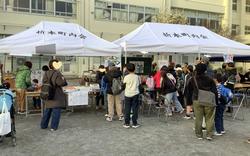 第二部として、校庭で6年生の総合的な学習の時間で取り組んできた「エールアート」のお披露目と「折本ふれあい祭り」を行いました。たくさんの子どもたちや保護者、地域の方でたいへん盛り上がりました。