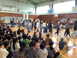 第二部として、校庭で6年生の総合的な学習の時間で取り組んできた「エールアート」のお披露目と「折本ふれあい祭り」を行いました。たくさんの子どもたちや保護者、地域の方でたいへん盛り上がりました。