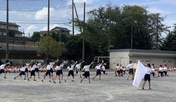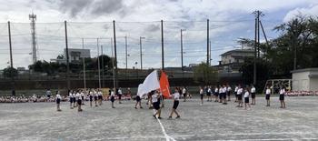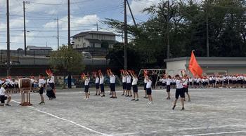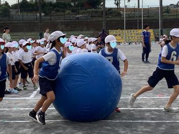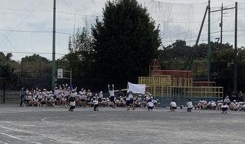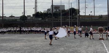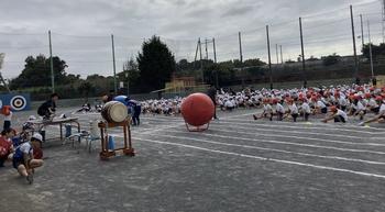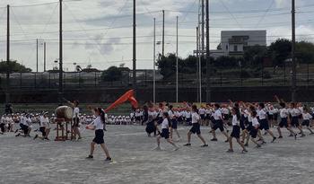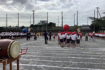 10月7日 1・2時間目に全体練習を行いました。今日は、応援席の確認、大玉送りと応援合戦の練習です。