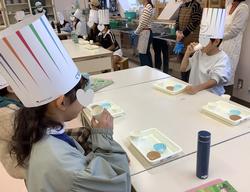 子どもたちの頭には、シェフのようなトック帽。フードアナリストの方からの説明を聞いて様々な体験をしながら、味覚について詳しく学びました。「うまみ」では昆布と鰹のだしを味わい、「苦味」では緑の粉が出てきて「これは何だ?」のクイズにみんな「抹茶だ。」「あのお寿司屋さんのお茶の粉だあ。」と口々に話していましたが、正解はオリーブ(の葉っぱ)。びっくりしていました。