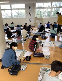 12月22日 3年生が書き初め「友だち」の練習をしていました。書く前に気持ちを静かに整えて・・・