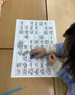冬休み明けのすごろくをグループごとに楽しむ3年生も。さいころを振ってとまったマスに書いてあることを発表します。