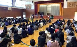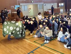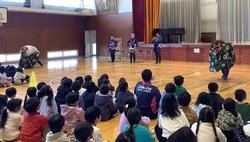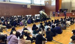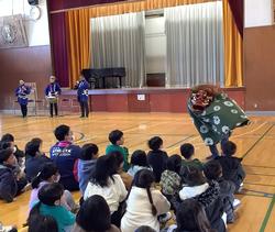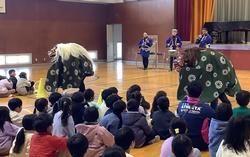 1月8日 折本お囃子連の皆様による獅子舞を全校2部(高学年・低学年)に分けて鑑賞しました。
