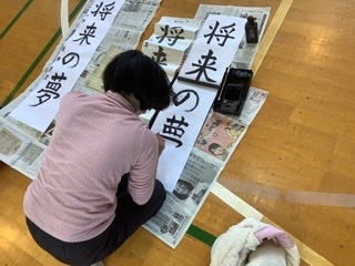書き初め大会をしました。冬休み前、冬休み中に練習した「将来の夢」をそれぞれの思いをのせて書きました。今年は卒業・進学の年。将来に向けて子どもたちは向き合い、考えていく年でもあります。その節目の年のスタートにあった字を書き、良いスタートを切ることができました。