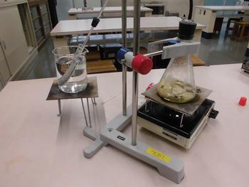 | 総合的な学習の時間では、ハーブや花から出てくるよい香りを集めています。フラスコで植物と水を熱し、水蒸気に変え、水で冷やしながら試験管に集めることができました。お気に入りの香りを見つけていこうと、意欲をもって取り組んでいます。 |