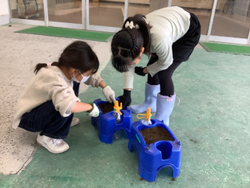 生活「おいしいやさいをそだてたい」の学習、冬野菜バージョンに入りました。まずは、育てたい野菜の種をよく見て、「こんなに小さい種から芽がでるのかな」「早く大きくなってほしいな」など思いをもちながら観察しました。次に、野菜名人に種の植え方を教えてもらい、自分たちで植えました。これから、芽が出るまでが肝心です。元気な野菜に育つよう毎日のお世話がんばりましょう。