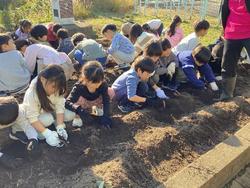 5月に植えていたサツマイモが実り、サツマイモ堀りをしました。つるがあったところを辿ってその周りを手で優しく掘ってみると、たくさんのサツマイモを収穫することができました。大きなものから、たくさん連なったものまで様々で、子どもたちは大興奮でした。掘っても掘っても抜けないところは、応援を呼んで助け合ったり、技術員の工藤さんや成田さんに手伝ってもらったりしながら協力してがんばっていました。
