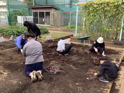 5月に植えたサツマイモの収穫をしました。収穫する直前まで畑を覆い隠すほどのたくさんの芋づるがあったのですが、技術員さんに協力してもらい、つるを取り除いてサツマイモを掘るだけにしていただきました。ずいぶんと深いところで育ったものもあり、ありとあらゆるところを掘り返し、たくさんのサツマイモがとれました。さて、何個とれた?何kgとれた?については、次の算数の時間に、クラスのみんなで調べます。