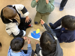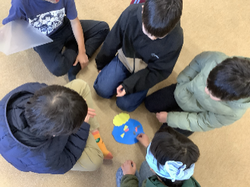 冬休み明けの1月9日(金)に学年集会を行いました。実行委員の子どもたちが中心となって、計画を立てました。今回の集会では、ゲームの内容を工夫して、お正月にちなんだゲームを2つ考えました。1つ目は、福笑いです。小グループで、顔のパーツを一つずつ並べて、鬼の顔を完成させるというものです。完成した鬼の顔を見て、グループのみんなで楽しそうに感想を述べていました。2つ目のゲームは、お正月バージョンの猛獣狩りです。しかし、時間が無くて、実施できませんでした。