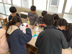 理科の授業で電磁石の性質について学習しました。電磁石は、コイルに電流が流れている間は磁石の性質をもつようになることが分かりました。学習の最後にはその性質を生かして釣竿をつくって、魚釣りゲームをしました。学習がゲームに生かされることで理科の楽しさを実感していました。 |