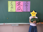 子どもたちに冬瓜に親しんでもらうため、1年生に皮の硬さや重さを体験してもらいました。全員初めて見るようで、4.5㎏もある冬瓜は1年生の顔よりも大きく、叩いてみてもびくともしない冬瓜に興味津々でした。実際に皮の硬さを感じることで、名前の由来にも実感がわいたようでした。