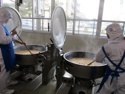 給食のカレーは、ルーも手作りでケチャップ・ソース・しょうゆ・塩・こしょうというシンプルな調味料で味付けをします。釜も2つに分けて作り、低学年と高学年で辛さを変えて作ります。