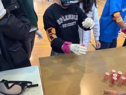 当日は、手足におもりや間接にサポーターを付けたり、視界を悪くするゴーグルを付けたりして日常の動作を行う高齢者疑似体験を行い、左近山地区に住む高齢者や高齢者を支える団体の方々のお話を聞きました。