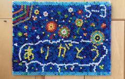 また、集めたペットボトルキャップの一部を使い、モザイクアートにもチャレンジしました。回収に協力してくださった方々への感謝の気持ちと色とりどりの「花火」をテーマにデザインを考えました。本校の体育館に飾ってありますので、ご来校の際はぜひご覧ください。