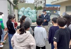 5年3組で回収を続けてきましたペットボトルのキャップを本日、回収業者の方に引き取りに来ていただきました。本日引き渡したキャップは、7月から2月までの回収分で、その重さは約250kgにものぼりました。この回収したキャップは約1kgあたり3.15kgもの二酸化炭素を削減することができます。このキャップ250kgで787.5kgもの二酸化炭素を削減することができたことになります。また、回収したキャップを専門のリサイクル業者に約1kg10円で買い取っていただき、その収益を発展途上国の子どもたちにポリオワクチンとして寄付します。
