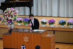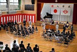 4月8日(水)春の暖かさを感じる中で入学式が行われました。新1年生の児童がドキドキしながらも嬉しそうな表情で式に参加していました。校長からの担任紹介は、歌声に合わせた楽しい発表となりました。担任のリズムのよいギター伴奏がみんなの心を弾ませました。挿入歌の歌詞には