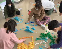 今回はペットボトルのキャップを使って、同じ色を集めたり、いろんな色を組み合わせたりしながら、並べたり、積んだりと思い思いに活動しました。素敵な模様になったり、不思議な生き物ができ上がったりと、初めは一人でやっていた活動が自然と友達との活動に広がっていき、楽しみながら熱中している姿が印象的でした。