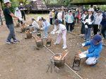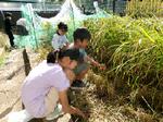 秋晴れの下、苗から育ててきたもち米が、実りの秋を迎えました。稲刈りも鎌を使うのも初めてという子どもたちも多く、全てが体験学習です。教科書や資料集で見たけれど、実際やってみるとわかることがたくさんありました。特に稲を束ねるところに苦労していました。いろいろな工程があることを知り、改めてお米を収穫することの大変さも学びました。もう1クラスは来週実施の予定です。