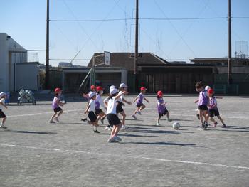12月8日(金)にサッカー食育キャラバンを行いました。F・マリノススポーツクラブよりコーチ2名をお迎えし、サッカーを通して体を動かすことの楽しさやおもしろさを体験しました。ボールに慣れた後は、試合形式のゲームでコートの中を走り回り、たくさん汗をかきました。最後には、コーチから食べ物には、それぞれ大事な働きがあることと、バランスよく食べることの大切さを学びました。