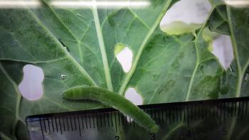 さいしょにうまれた赤ちゃんをそだてていたら、こんなにも大きくなりました。大きさは3cmぐらいで、えいようまんてんの芹が谷ばたけのキャベツをモリモリ食べているのでどんどん育ってきました。体には細かい毛が生えています。次回のかんさつもお楽しみに!