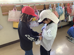 その後は教室に移動し、「1年生ってこんなことをするんだよ。」と教科書を見せたり白衣を着せてあげたりしました。
