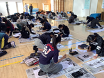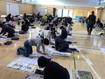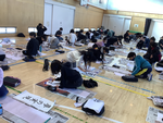 1月9日、体育館で書初めを行いました。書いた文字は「世界の国」です。