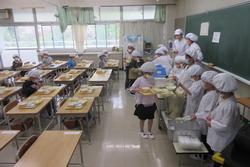 一人ずつ慎重に運んでいます。給食当番も丁寧に配膳していました。