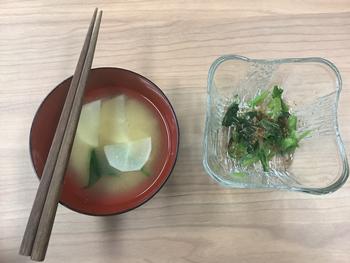 大根、小松菜、じゃがいものみそ汁と、ほうれん草のおひたしです。