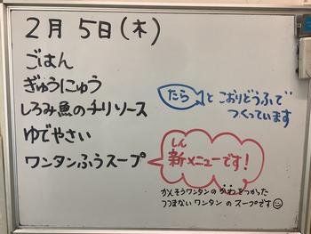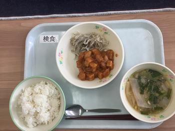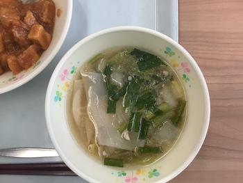 今日の給食は新メニュー「ワンタン風スープ」が初登場。