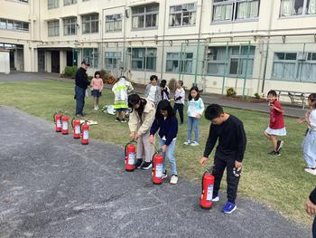 本物の消防車に触れ、耐火服を着て、消火器の使い方も実践しました。