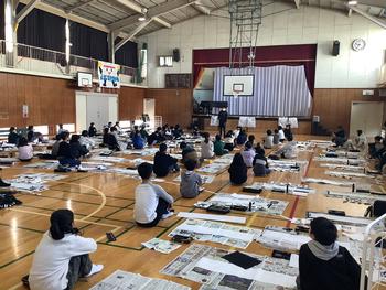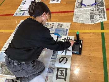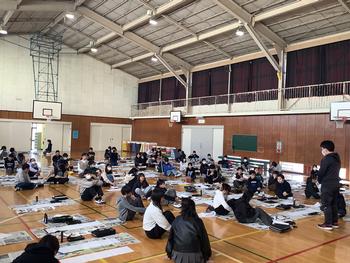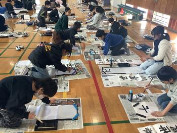 厳かな雰囲気の中、落ち着いて筆を取る子どもたちです。