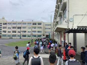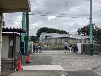 朝の校門は、校外学習に行く1年生が一番に並んでいました。