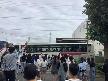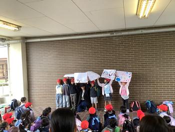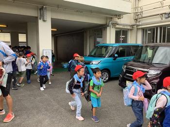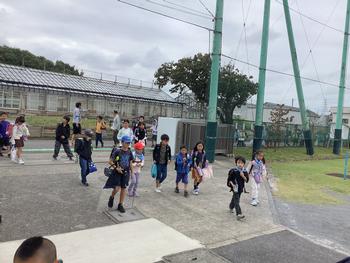 ペア学年の6年生が優しい表情で見送る中、元気よく出発です。