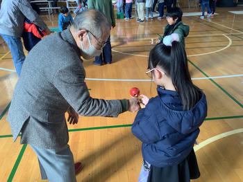 今日は1年生の昔遊びの会でした。地域のシニアクラブの方にご来校いただき、学年のみんなでコマやけん玉、メンコなど一緒に楽しみました。1年生は初めて経験するものも多いようです。こういった機会を通して伝統的な遊びにふれるのもいいですね!