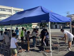 子ども達は締まった地面にブラシをかけながら、テントの設営や応援団や放送のリハーサルを行いました。