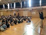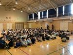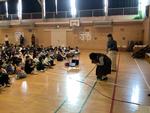 その後、各学年の代表が感想を伝えた後、4年生の指揮で全校で今月の歌である「夢見るジャンプ」を歌いました。