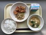 この日の献立は、「ご飯」「牛乳」「ごま醤油和え」「味噌汁」、そして「鶏肉の竜田揚げ」です。