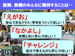 10/14(火)後期始業式が行われました。子どもたちは、学校生活の大切な節目として落ち着いた雰囲気の中で式に参加しました。子どもたちは、どのように式に臨めばよいかを理解し、静かに、そして真剣な表情で新たなスタートを迎えました。始業式では、前期の振り返りをもとに、後期も「えがお・なかよし・チャレンジ」を大切にしていこうということを確認しました。前期に学校を力強くリードした6年生の姿は、来年度の最上級生となる5年生にも受け継がれています。特に、三浦での体験学習では、クラスの仲間と安心できる雰囲気をつくり出し、笑顔を大切にする姿が印象的でした。また、音楽朝会では、仲間と共に学び、発表する姿が大きな感動を呼び、子どもたちの心に深く残る経験となりました。学習面でも、自分たちで「学ぶべきこと」を判断し、主体的に学習に取り組む姿勢が育まれています。自分の考えをしっかりと発表するなど、「自分で考えながら学ぶチャレンジ」の姿が随所に見られます。後期の新橋小学校に期待することとして、児童たちは次の3つを確認しました。安心できるクラスづくり・学年づくり「えがお」、仲間と共に学ぶ「なかよし」、自分で考えながら学ぶ「チャレンジ」この3つの柱を大切にしながら、後期も新橋小学校全体で成長し合える日々を積み重ねていきます。