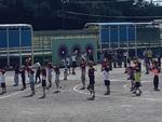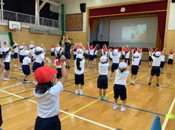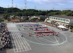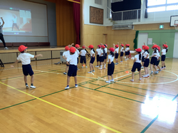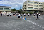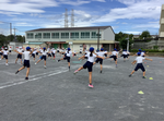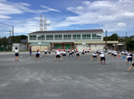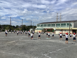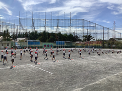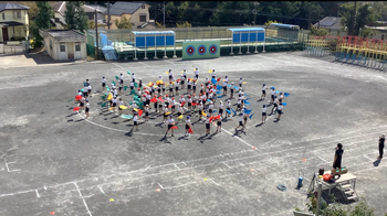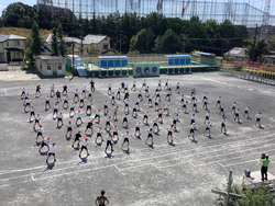腕を伸ばしたり、足を大きく踏み出したりして体を大きく使って踊れるように練習しています。元気いっぱいのかけ声を校庭に響かせながら運動会に向けての気持ちを高めています。