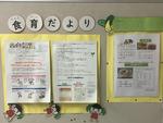 新橋小学校では、給食室前の廊下が「食のプロムナード」として、子どもたちの食への関心を育む場となっています。ここでは、栄養職員による様々な発信が日々行われており、食育の大切な拠点となっています。プロムナードに設置されている「栄養こくばん」には、毎日の給食の献立や使用されている栄養素がわかりやすく記されており、子どもたちは食べることを通して栄養について学ぶことができます。また、毎月発行される「食育便り」では、季節の食材や地域の農産物についての情報が紹介され、食の背景にある人々の思いや工夫に触れることができます。また、新橋独自の「食育広場」の掲示は、泉区で収穫された野菜や果物が給食に登場する様子や、それを育てた地場農家の方の紹介など、食材の“向こう側”にある物語が丁寧に記されています。今月は、旬のカツオについての豆知識や、今月のデザートだった梨がどのくらいの量が、どのように調理されているのかが掲示されており、子どもたちは季節の移ろいを感じながら食事を楽しんでいます。給食室の前を通るたびに、行事食や地域とのつながり、季節の恵みなど、食にまつわる多様な学びが広がるように努めています。食を通して「人」「地域」「季節」とつながる心を育てていきたいと考えています。